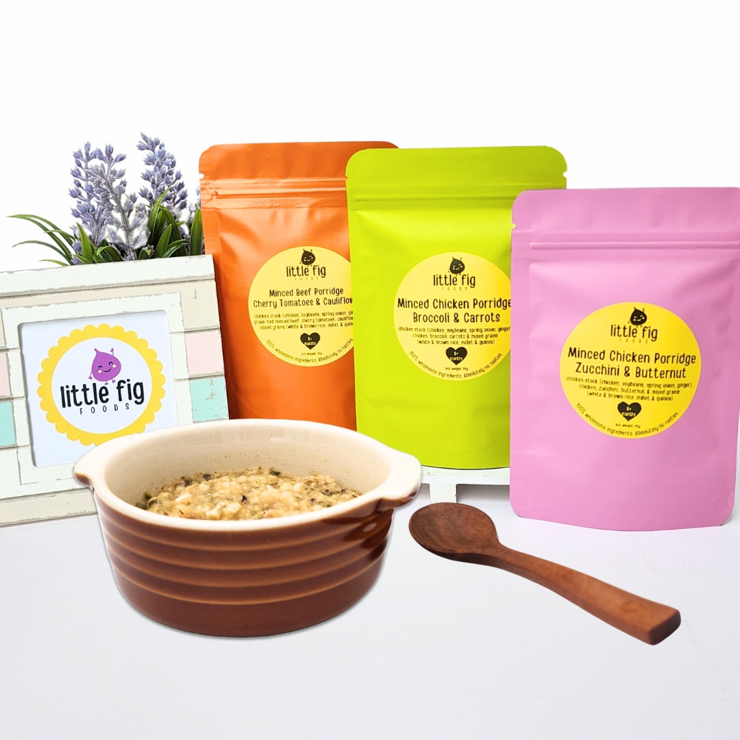 Prepared using a delicate chicken stock infused with the goodness of chicken, soybeans, spring onion, and ginger. These ingredients lend a mild and soothing taste to the porridge, providing an easily accepted flavour profile for your little fig's developing palate.