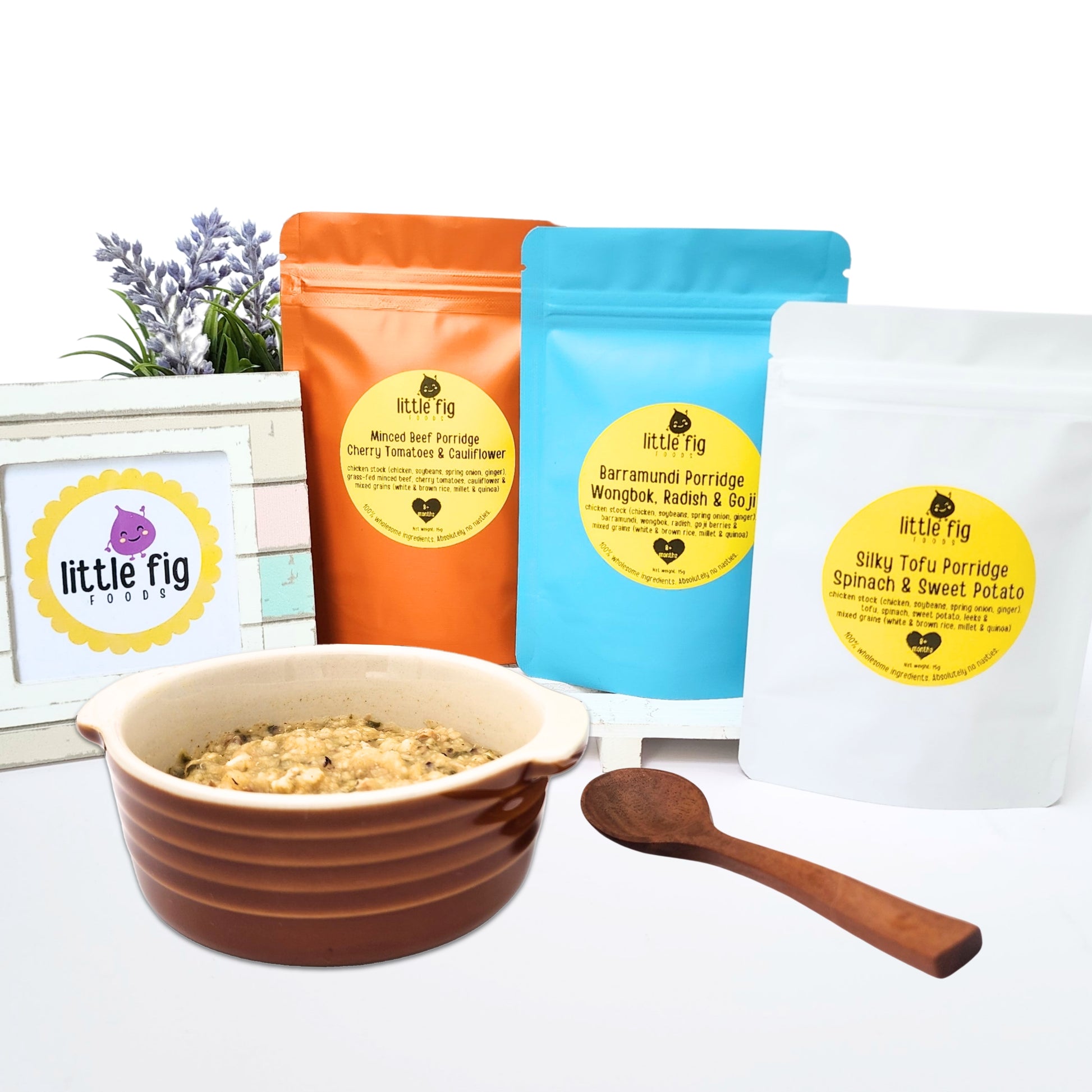 Prepared using a delicate chicken stock infused with the goodness of chicken, soybeans, spring onion, and ginger. These ingredients lend a mild and soothing taste to the porridge, providing an easily accepted flavour profile for your little fig's developing palate.